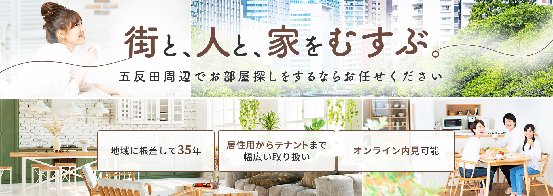 地域に根差して35年、積み重ねてきた実績と情報力を活かし、居住用物件をはじめ、事業用物件やテナント、駐車場まで幅広く取り扱っています。